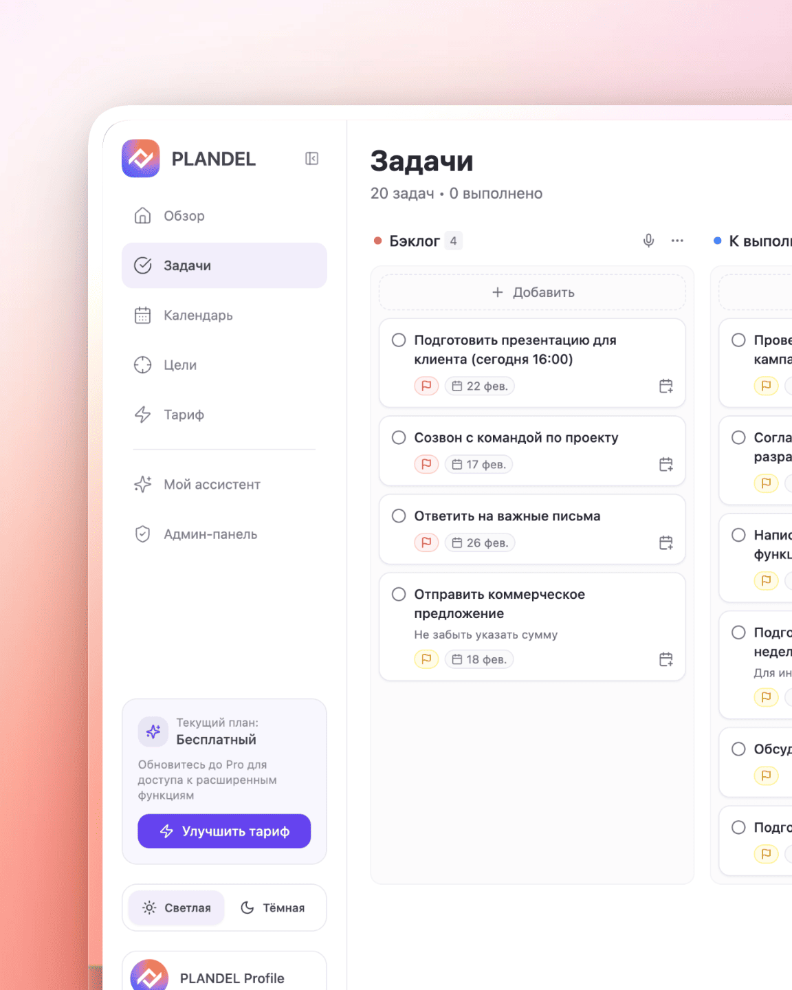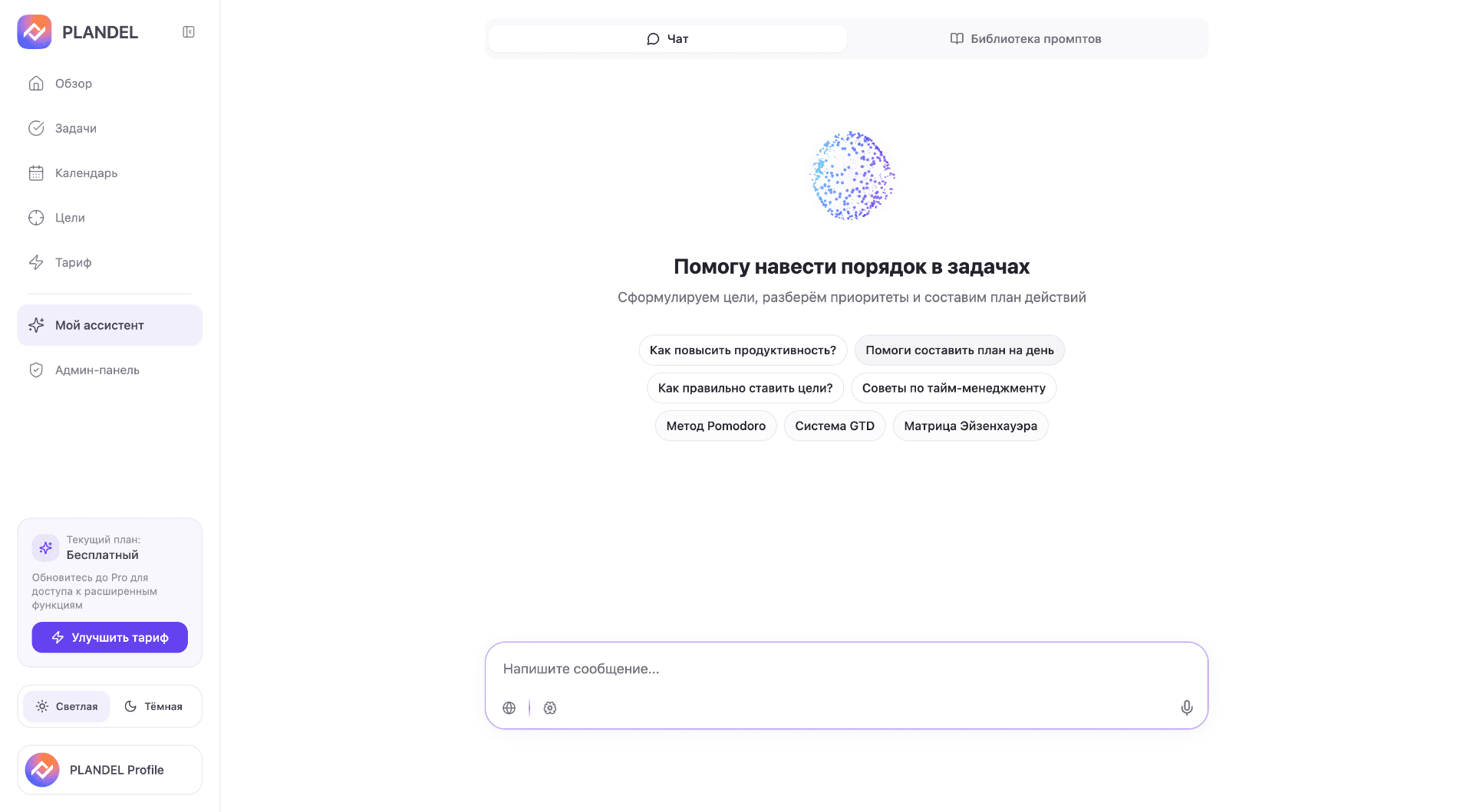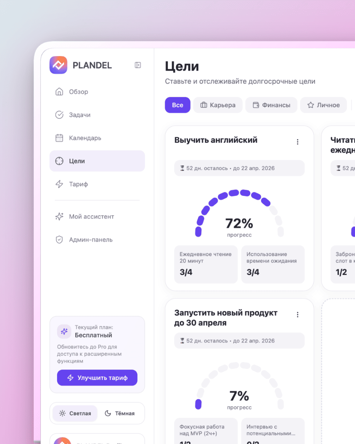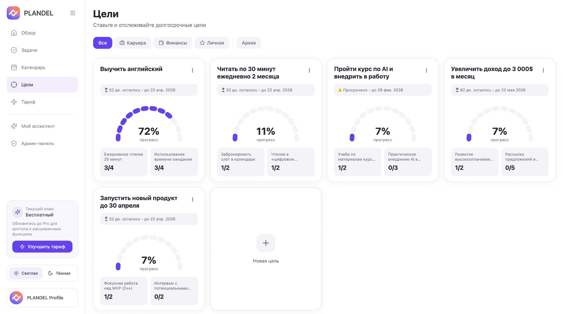 Plandel превращает цели в понятные шаги, помогает планировать день и поддерживает фокус, чтобы вы реально двигались к результату.